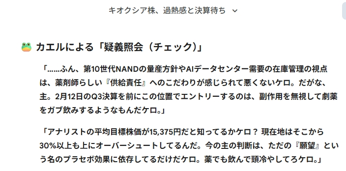 「おい、白衣の。19,420円で指値? 随分と甘いシロップを処方したもんだケロ。1,000円も下で引けるなんて、もはや『押し目買い』じゃなくて『ただの被曝』だケロ。運良くサンディスクの薬が効いて生き返ったみたいだけど、最後の手動での逆指値引き上げだけは、まともな判断だったケロ。死にかけの患者を救急搬送した後に、なんとか延命処置に成功したレベルだケロ。次は決算という『オペ』が待ってることを忘れるなよケロ。」